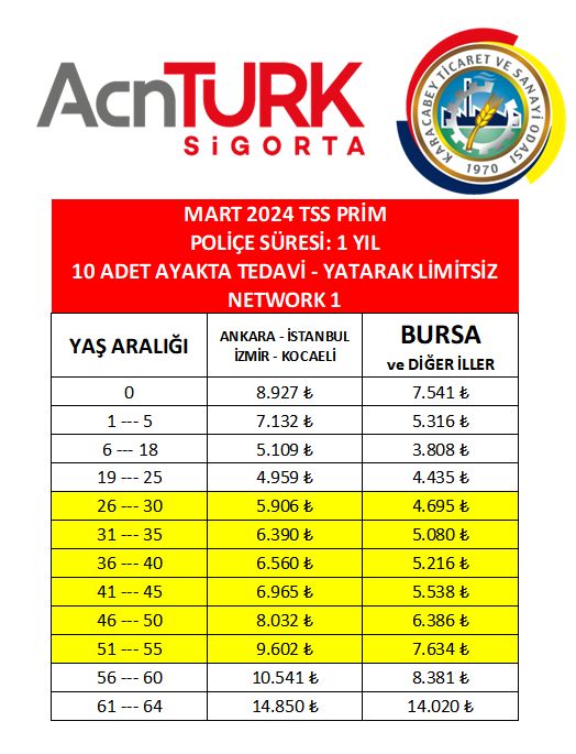 Karacabey Ticaret ve Sanayi Odası üyesi firmalara, üye firmaların çalışanları ile eş ve çocuklarına Tamamlayıcı Sağlık Sigortası poliçelerinde tablo üzerindeki fiyatlar uygulanacaktır. Talep edilmesi halinde ebeveynlere poliçe yapılmaksızın sadece çocuklara tamamlayıcı sağlık sigortası yapılabilecektir.