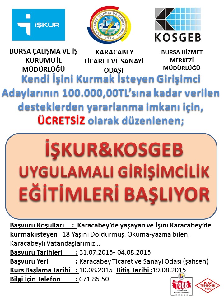 Karacabey Ticaret ve Sanayi Odası, KOSGEB ve İŞ-KUR işbirliği ile düzenlenen Uygulamalı Girişimcilik Eğitimleri 10 Ağustos 2015 tarihinde başlayacak.